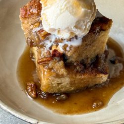This honey pecan sourdough pudding cake is pure comfort. A fluffy, lightly tangy sponge soaked in a glossy honey-brown sugar syrup, finished with crunchy pecans and served warm with melting ice cream.